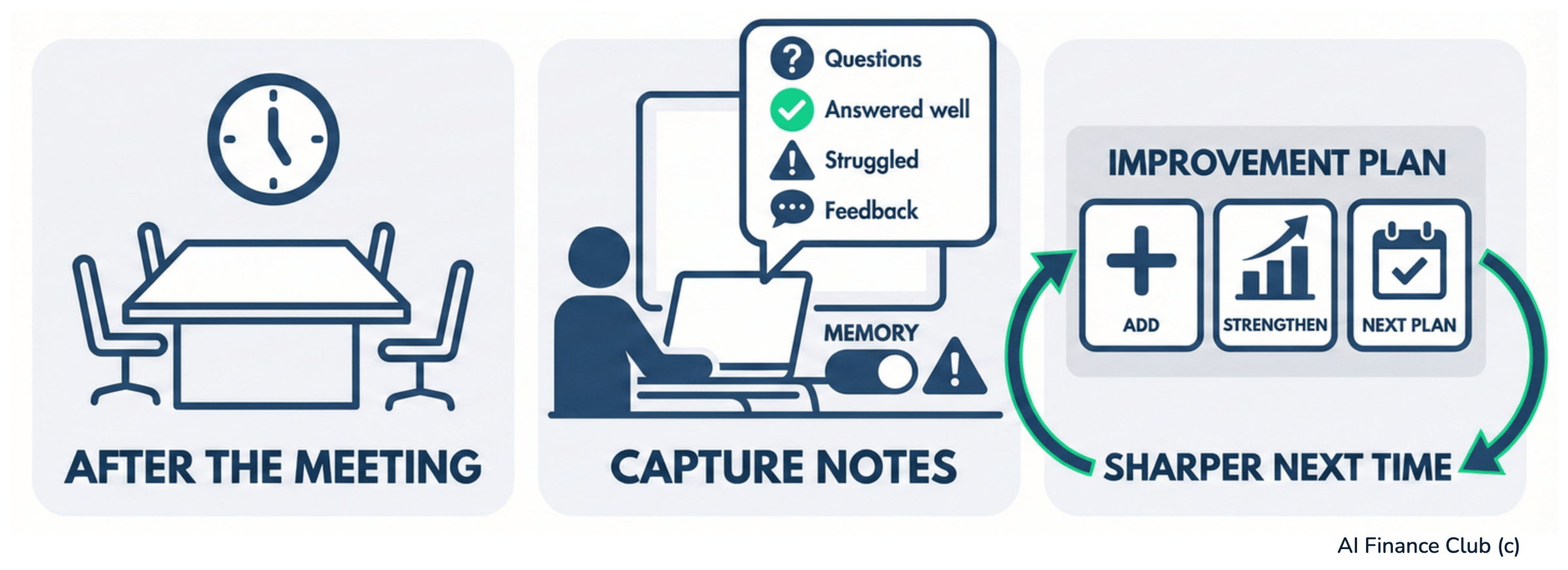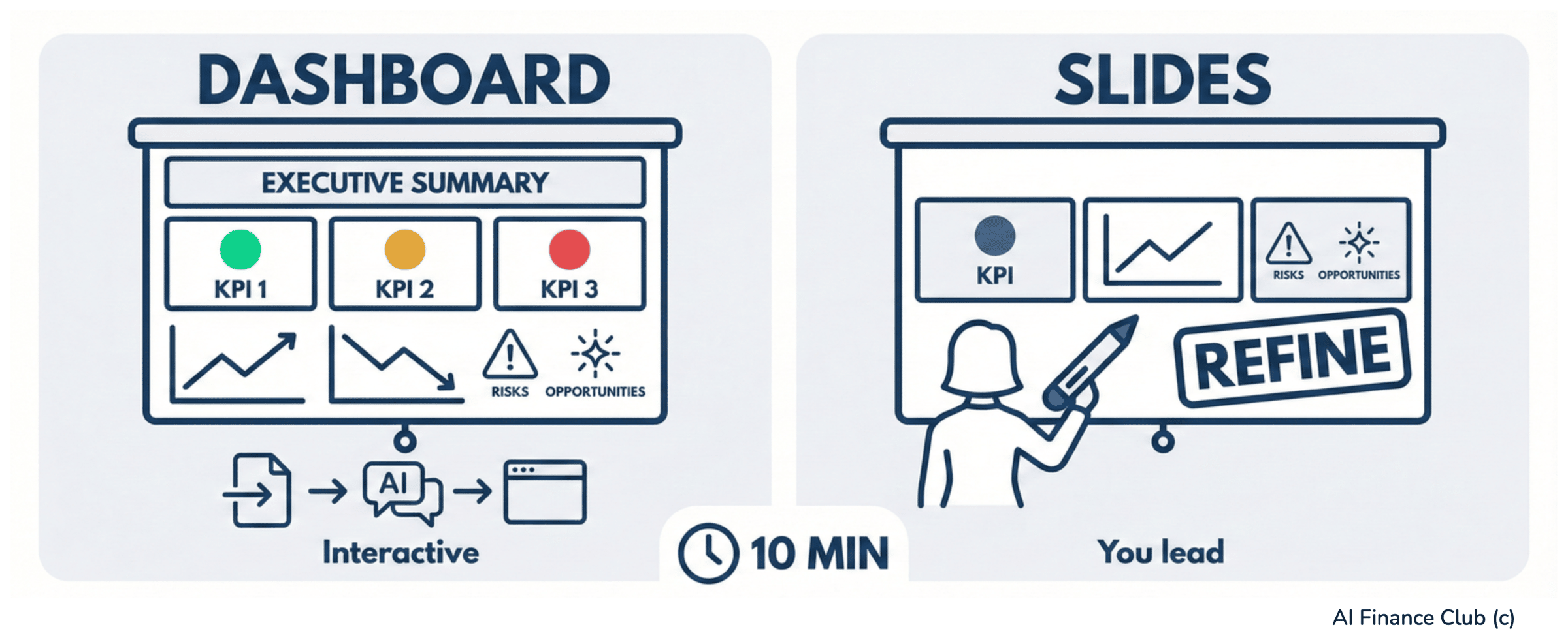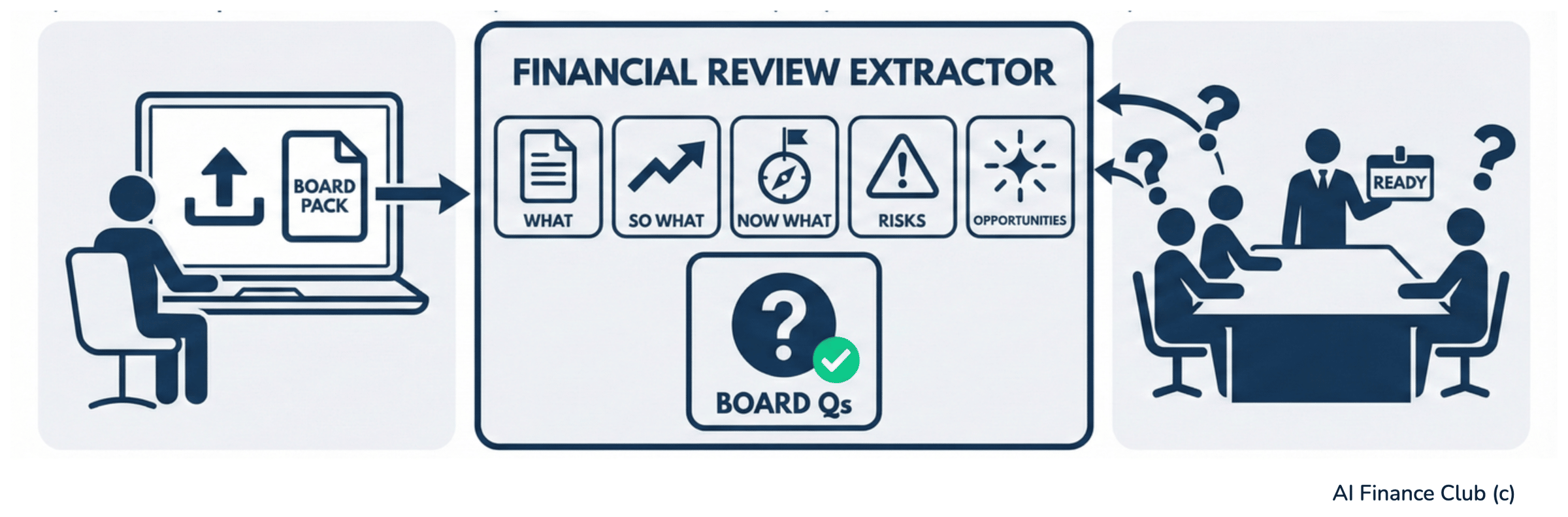 Every month, in my previous role, I was spending 3 days preparing the Business Operational Review presentation. You know this feeling. Three stressful and super frustrating days of pulling data together, formatting slides, and making sure the numbers all match. And the crazy part is not even the time it takes to build the deck. What nobody prepares for is what happens when you walk into the room. When the CEO looks at you and says, "So what happens to our cash position if we delay the expansion by two quarters?" or "Can you walk me through the sensitivity on those assumptions?" And you do not have the data structured in a way that lets you answer on the spot. So you say the worst sentence in any board meeting: "Let me get back to you on that." I know this because I have lived this. And I have watched dozens of finance leaders live this in the teams I train. The mistake you make here is thinking that time spent creating slides is the same as time spent preparing for the presentation. And then after the meeting? You just move on, without reviewing what happened, and without a way to improve for next time. So today I want to show you a different approach. Three phases that cover the full lifecycle of a board meeting. How you prepare, how you perform, and how you review afterwards. All using AI. And my goal is that after reading this, you are able to take your board & stakeholder communications to the next level.