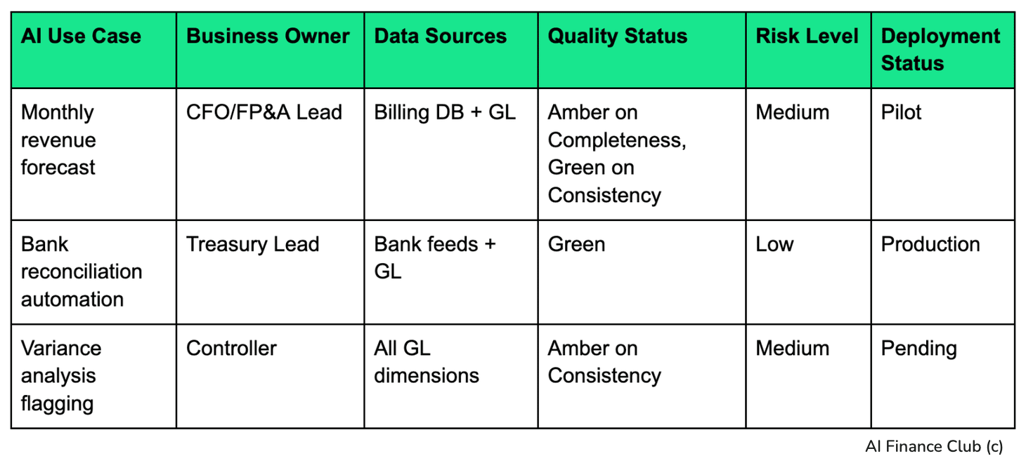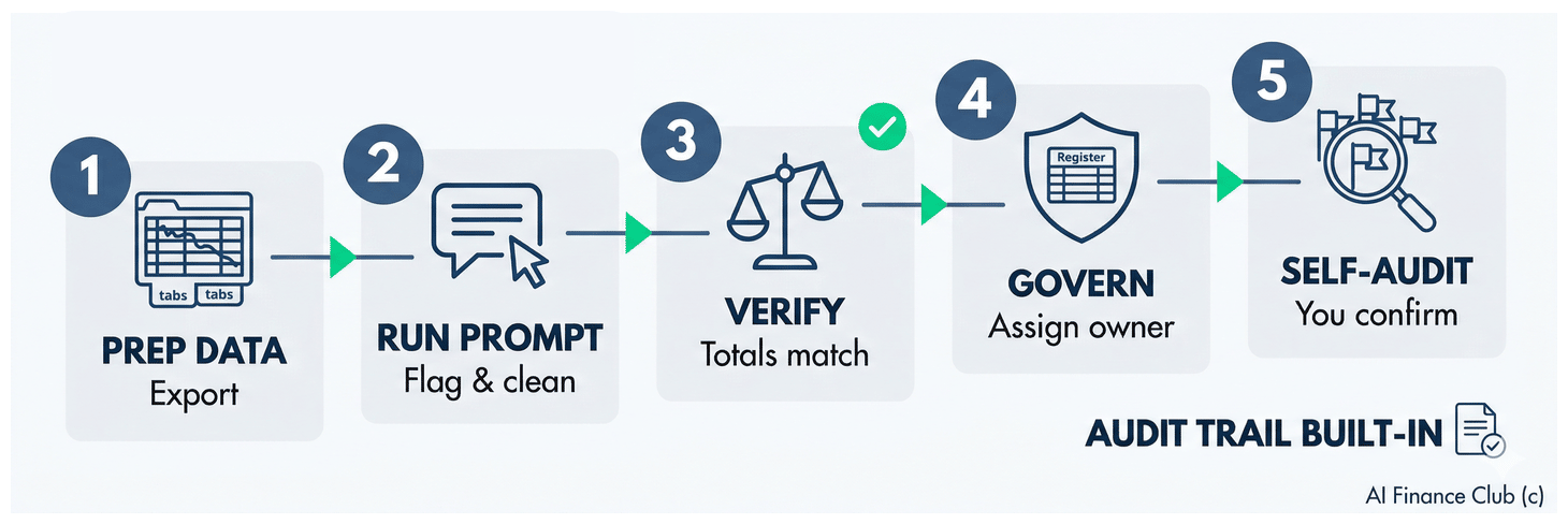 Step 4: Build your governance registerNow that you have clean data, you need control. Christophe Atten in a recent workshop raised the accountability question: "Who is accountable if AI produces wrong outputs?" Without clear governance, you're at risk (from 7 years as an Auditor for PwC, trust me when I say this). So, make sure to create one simple Excel register: Update it monthly. This register answers: What AI is running? Who owns it? Is the data ready? What's the risk? It's your control layer, and it also provides accountability. Step 5: Run an AI self-audit, then manually verifyDon't ask AI to fix things to begin with. Ask it to audit and flag. Upload your cleaned data and use this prompt: Review this financial dataset. Identify any anomalies or gaps. For each issue you find, tell me: