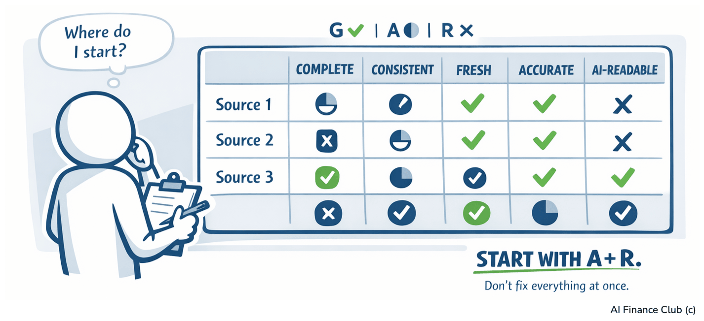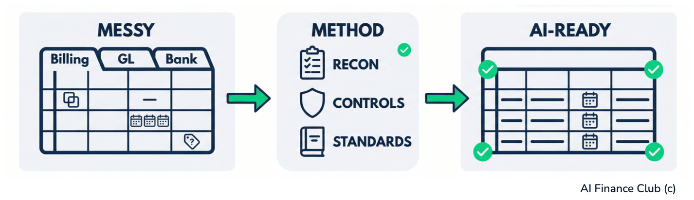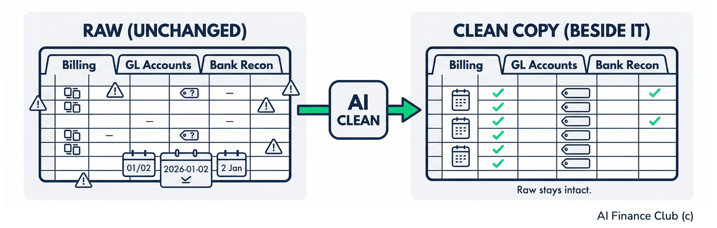 My friend Christian Martinez had a mess. Three Excel tabs. Billing transactions on one. GL accounts on another. Bank reconciliation on the third. Cross-referenced rows were incomplete and dates had three different formats. Duplicates existed and GL codes were missing. He needed to clean it. Or have a complete nightmare on his hands. So he did something super smart. Instead of spending two days manually fixing things, he used AI to automate the entire process. (this is why he teaches inside my AI Finance Club) But - and this is really important - he never changed the raw data. He created a cleaned version beside it. Most people don't do what Christian did. They take that same mess and give it to AI and expect it to work. But AI doesn't always push back. It doesn't say "hey, your dates are in two different formats, which one do you want?" It just picks one. Then it gives you something that looks good, but is completely wrong underneath. I see this all the time. A forecast that looked perfect but had double-counted revenue. Why? Because nobody flagged the duplicate rows before uploading. The AI treated every single row as fact. And this is the thing that I want to tell you today. You do not need perfect data to use AI. But you need to understand what's broken first, because AI can take your existing problems and make them worse. In a way that looks really good on screen! Your Data Has 3 ProblemsYou have messy data. There is no getting away from this. I have never met anyone with perfect data. 57% of companies say data reliability is their biggest blocker against AI success (Informatica - CDO Insights 2026). Plus, most companies' governance hasn't kept up with their speed of AI adoption. So, you've bought the AI, trained people and run pilots. But you have not given your data the same attention. As I've said before: "If you use AI with those tables that are made for humans, you are not going to get a good output." And the reason is simple. Your data has three core problems, which AI can make worse if you are not careful.. Problem 1: Inconsistent formatsYour dates are in three different formats. Some columns use thousands, others use ones. One system says "United States", another says "US", a third says "USA." When you're in the spreadsheet yourself, you notice this. And you fix it as you go. AI might not notice. It just makes an assumption about which format is correct and moves on. Problem 2: Missing dataWhat if GL codes are blank for 15% of your transactions? You'd flag them and ask someone to fill them in. AI might fill them in too, but it doesn't ask you first. It looks at the patterns in your data and makes its best guess. And those guesses are the dangerous part because they look like they could work. Nothing tells you which ones are real and which ones aren't. Problem 3: Duplicates and Dirty recordsWhen you work with this data manually, duplicates are frustrating but you spot them eventually. With AI, every row can get treated as truth. So your duplicates don't cancel out and things get inflated. But nobody questions this until someone tries to reconcile back to the general ledger and the numbers don't match. So. These three problems are nothing new. You've been dealing with them your entire career. The difference now is that AI sits between you and the data. And instead of showing you the errors, it hides behind a clean-looking output. But… You already know how to fix this! You reconcile monthly. You audit internal controls. You understand IFRS and SOX. And those same skills apply to data and AI. You just need an AI method to clean and audit. Red, Amber or Green?Before you even begin thinking about cleaning your data, you need to understand it. So, pick your top three data sources. Then score each one across these five dimensions using RAG (Red/Amber/Green): Completeness. Are all required rows and columns populated? Green = everything there. Red = more than 10% missing. Consistency. Are all formats standardized? One dataset has dates as DD/MM/YYYY, another as MM/DD/YYYY. One has currency in thousands, another in ones. One codes country as "United States", another as "US". Green = all matching format. Red = multiple formats across the dataset. Timeliness. How fresh is the data? Green = refreshed daily. Red = refreshed monthly or slower. Accuracy. Spot-check 10 rows. Do they match your general ledger or bank statements? Green = 100% of spot checks match. Red = less than 80% match. Accessibility. Can AI actually read it? Is it locked? Is it a PDF? Does it have hidden columns? Is it multiple nested tabs? Green = CSV or clean single-tab structure. Red = PDF, image, locked, or deeply nested. You'll usually find Amber ratings on Completeness and Red on Consistency. And this is exactly where you start. Don't try to fix everything at once. How to Clean Your Data Using AISo, let me show you how to do what Christian did, step by step. Step 1: Prepare your raw data.Export your messiest dataset, the one with duplicates, formatting issues, missing values (the ones that showed up Amber or Red). Have it ready in Excel or CSV. Step 2: Use this promptUpload your data (make sure to use a secure AI tool and its reasoning mode) and ask: I have a financial dataset combining [describe: e.g., billing transactions, GL accounts, bank reconciliation]. The specific problems are: