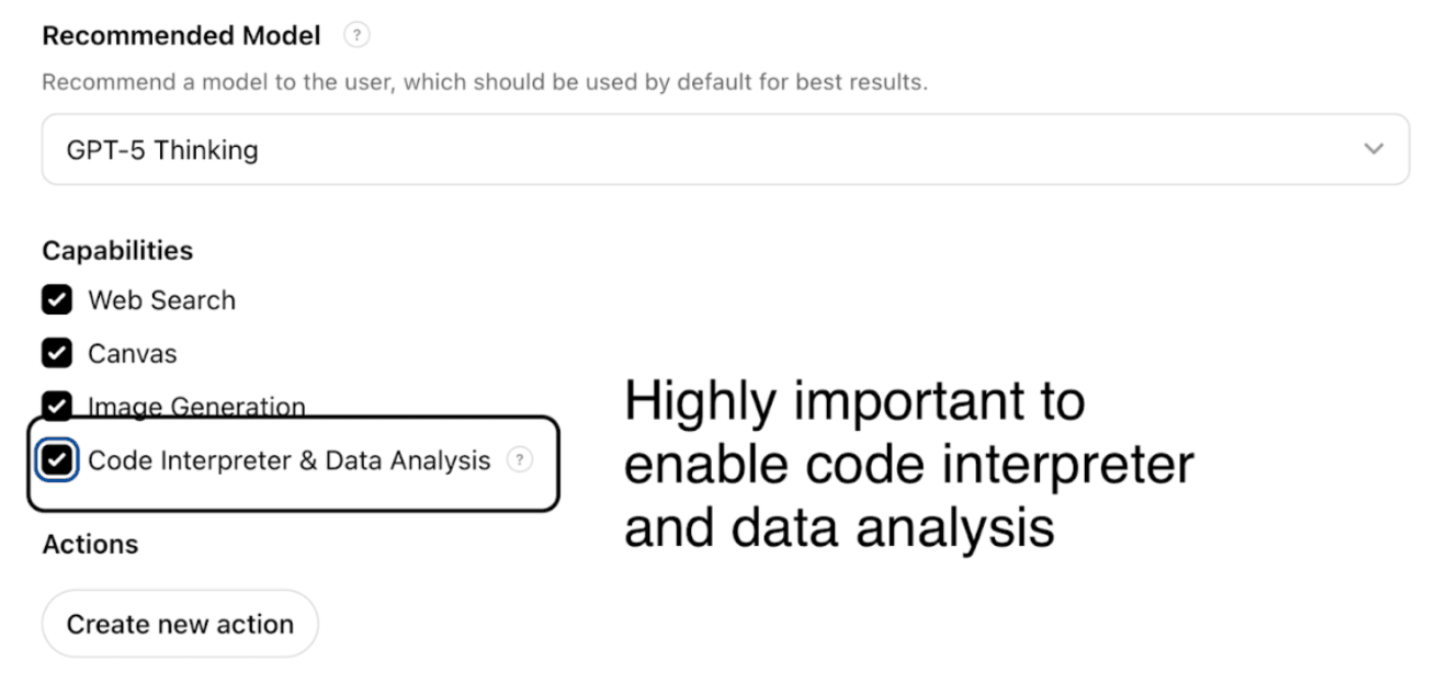 This allows analysis of data and performs mathematical computations. The recommended model is “GPT-5 Thinking”.