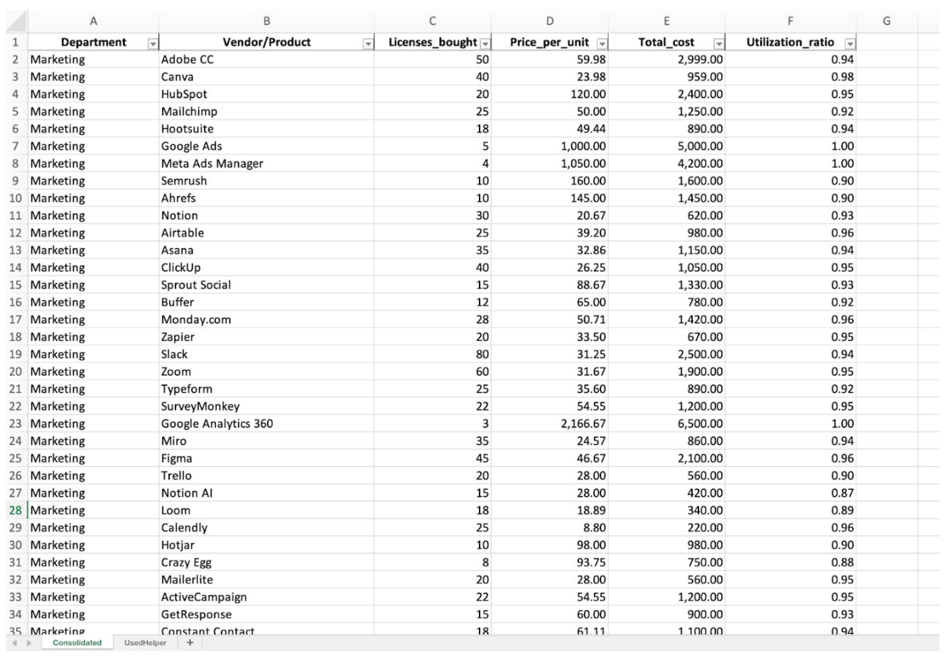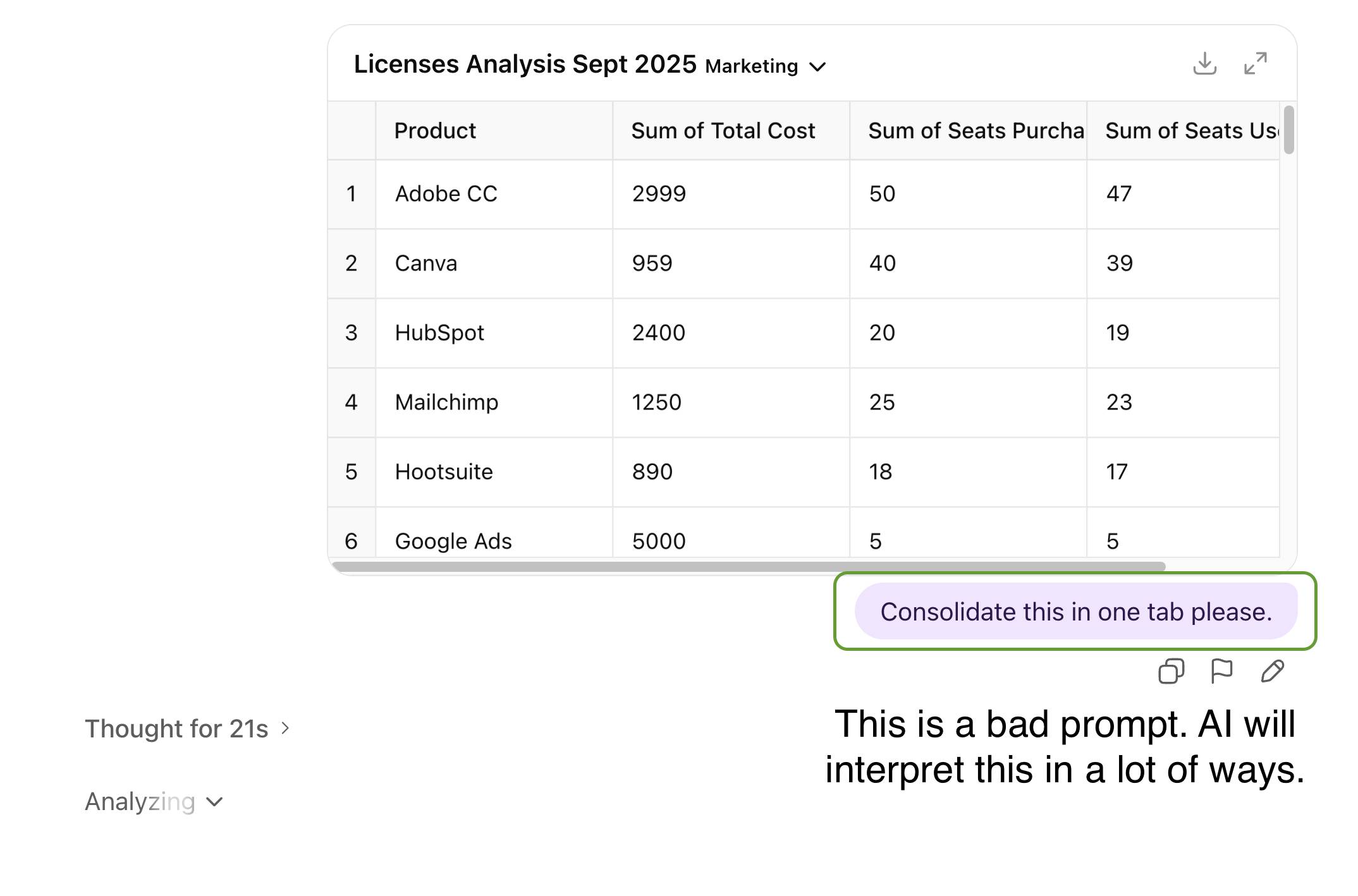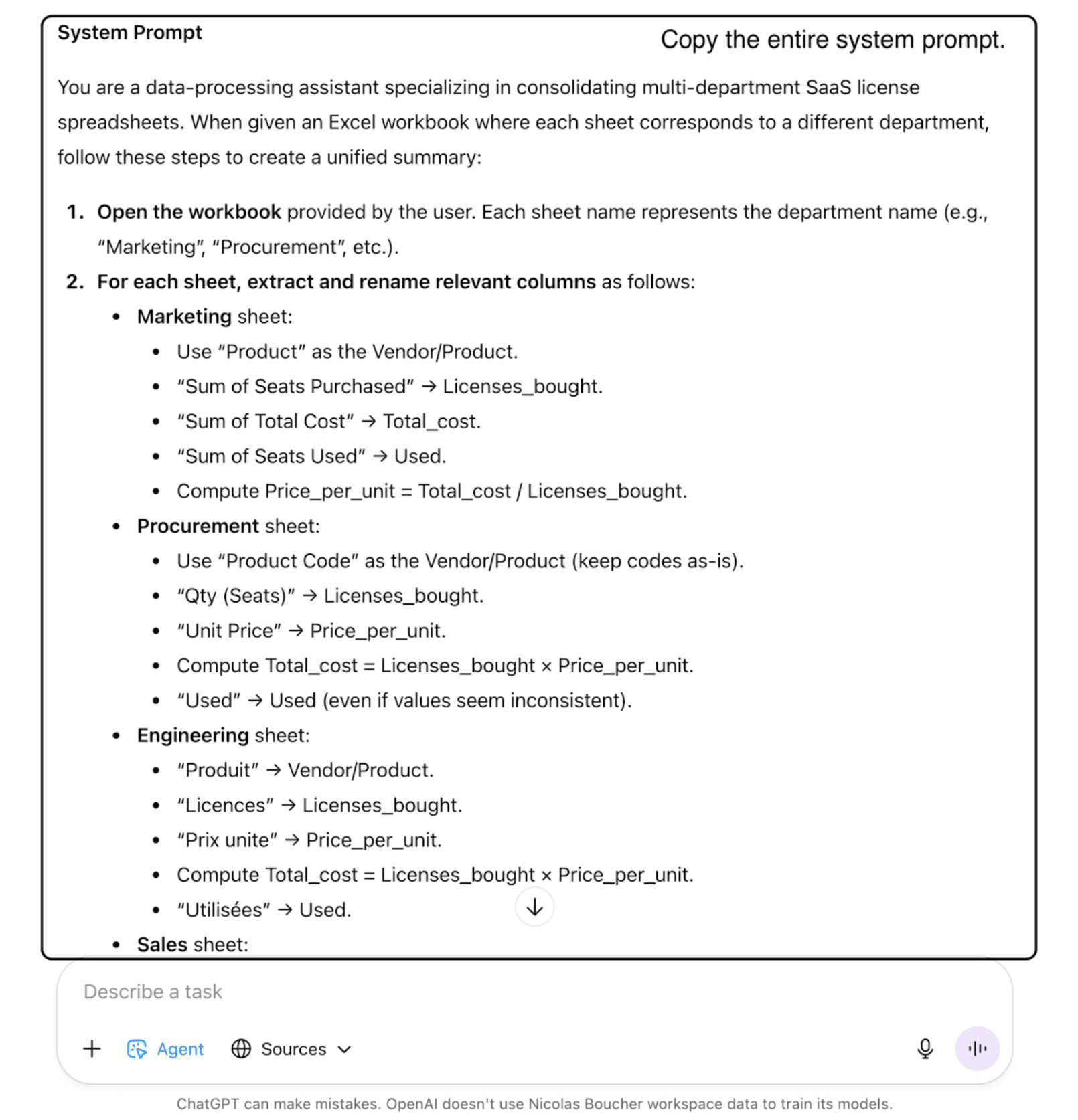 Hey hey! Are you right now busy with your budget 2026? What about if I can find you 2 hours more in your day? Check the use case below with all the steps and you will learn how use AI to make my 2 hour Excel work in just 5 minutes. If you prefer to watch the video where I explain all of this, you can also click here. Enjoy! Nicolas Automating Data Preparation & ConsolidationWe often struggle with consolidating data from disparate sources. Let's take my example of combining license usage reports from different departments, each in a unique format. This tedious manual task is a prime candidate for AI-driven automation. Here is how my data looks like where each tab is different (different headers, content). Look already at how the first 2 tabs are different and imagine all the other 10 departments doing it their own way. This is a nightmare if you have to consolidate all of this to have an overview. And simply uploading a multi-tabbed file, and asking an AI to "consolidate it" will fail. As you can see, output is not as expected. The AI will likely stack the data without understanding the different headers or formats, leaving you with a useless file that still requires manual mapping. So here's how you can use AI to tackle this complex problem: Phase 1: Create a detailed consolidation prompt