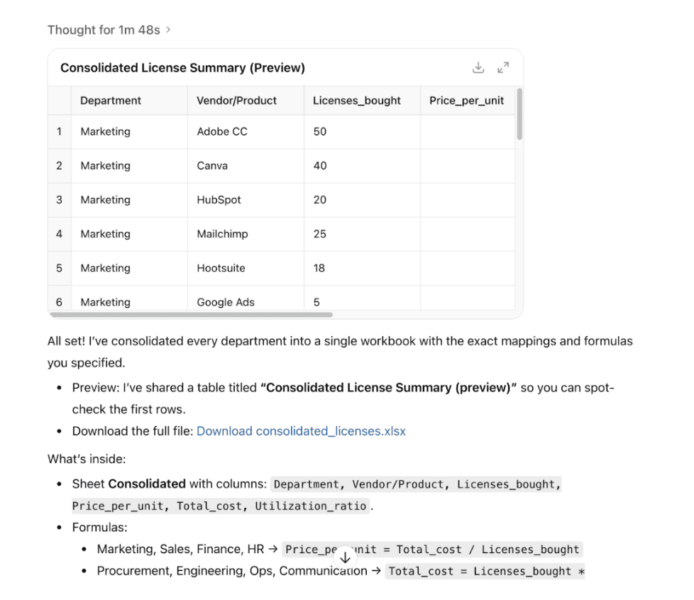 Now, instead of writing a complex prompt each month, any team member can simply upload the new file to your "License Consolidator" GPT and receive a perfectly formatted and consolidated report in seconds.