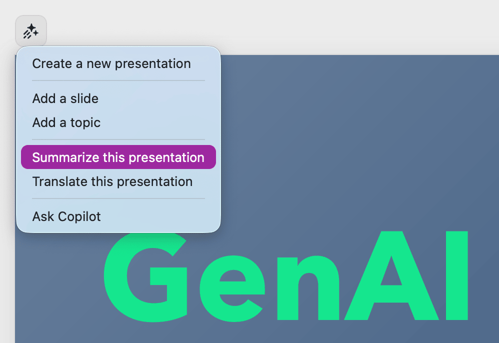 Click the Copilot button at the top of your screen. Select "Create a presentation about..."