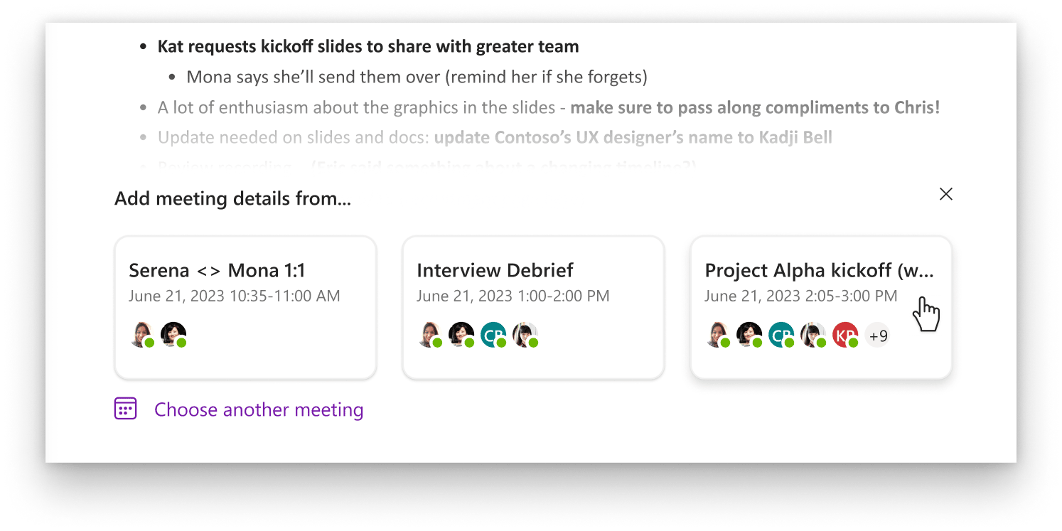 What it gives: meeting info + content from Teams’ intelligent meeting recap, including AI-generated meeting notes, AI-suggested tasks, and documents shared during the meeting.