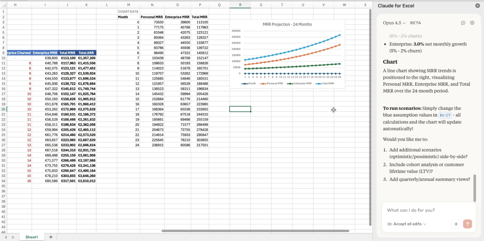 First, directly in Claude as an interactive web model. Then exported as an Excel file with formulas. And finally, the best way (running directly inside Excel using the Claude plugin).