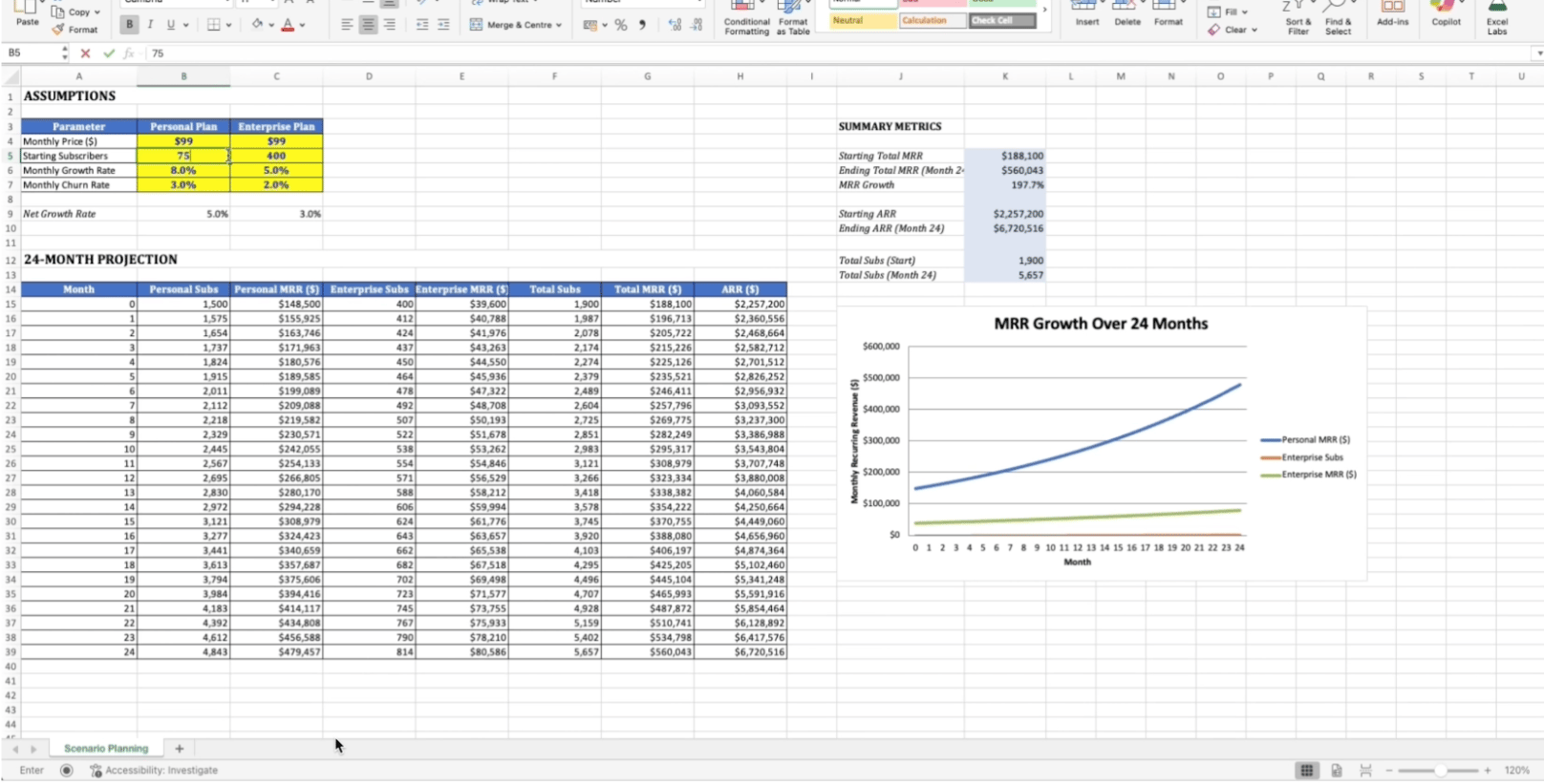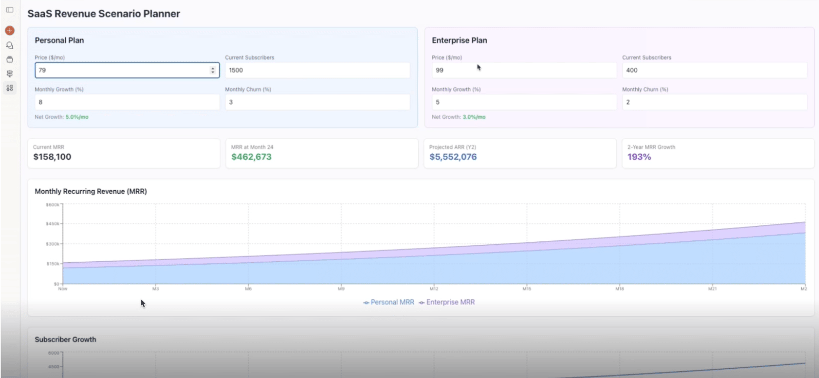 After a few seconds, Claude builds the model and you can change it directly inside. If you have a meeting, you can adjust all of the assumptions live. The graphs change in real time. You can change the churn, the price, the starting subscribers. Everything is dynamic.