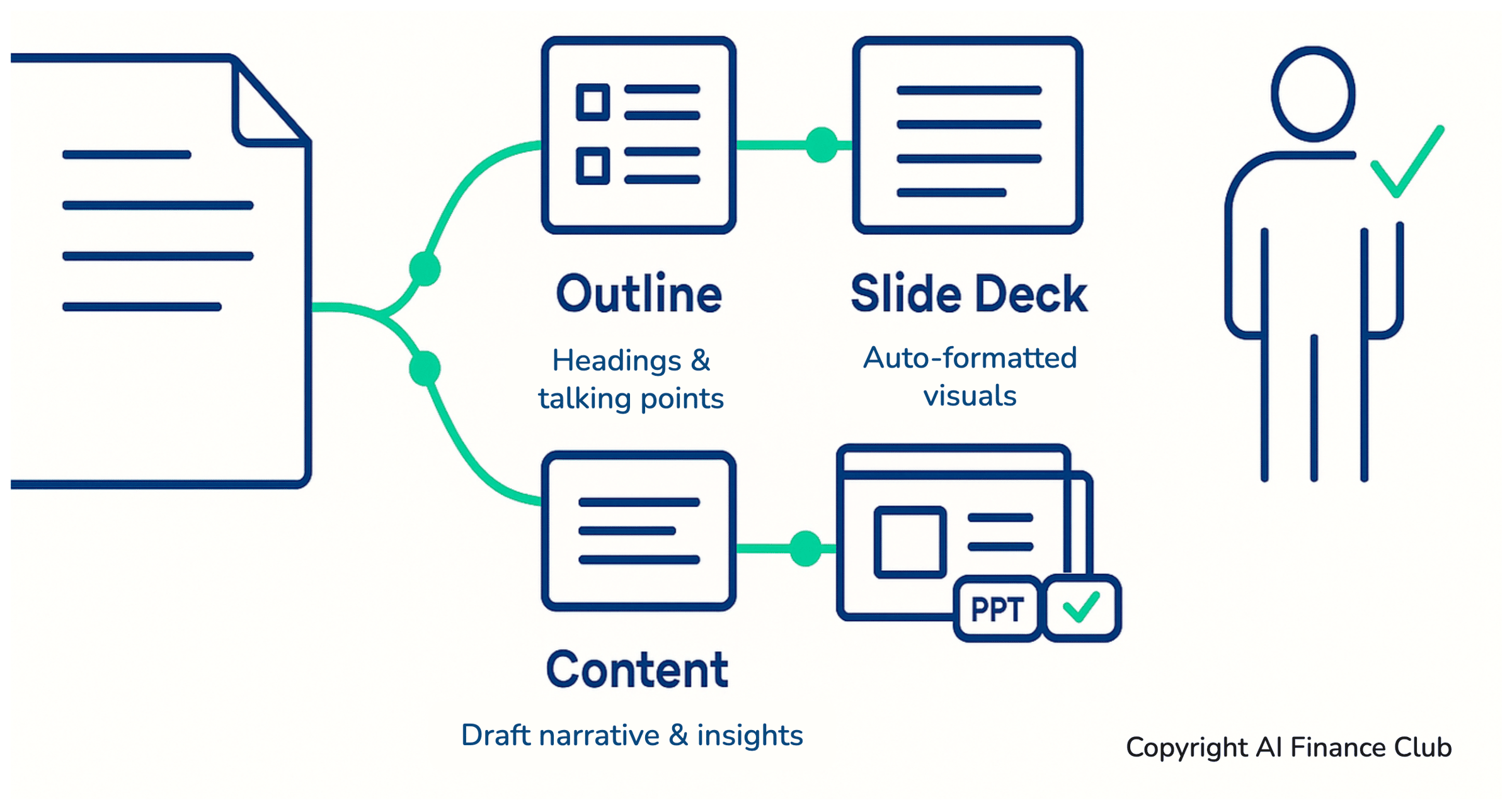 Hello Reader, It's late Friday afternoon, and your boss just informed you that the quarterly sales review, originally scheduled for next month, has been moved to Monday morning. You need to present the team's performance, new client acquisitions, and forecast for the next quarter. The sales data is spread across multiple spreadsheets, and the marketing team hasn't finalized their contributions for the new product launch section of the presentation. To top it off, your laptop charger broke, and you're running on a limited battery. What if I told you AI can do this in 15-30 minutes? Generate a clear outline, craft a compelling narrative, and even create the initial slide deck automatically. So when schedule is suddenly changed, you do not panic. Here's how... The Power of Financial StorytellingOkay, so you've got the numbers, the charts, the spreadsheets...but does your audience truly get it? In my experience, many finance professionals are brilliant with data, but sometimes that brilliance gets lost in translation. We present facts, figures, and analyses, but we often miss the crucial step of turning those into a story that resonates and drives action. Think about it: you're in a critical meeting, presenting your findings. You've spent hours meticulously preparing. But if your presentation is just a "data dump," what happens? Eyes glaze over. Questions arise that you thought you'd already answered. Decisions are delayed because the "so what?" isn't clear. This is where the power of financial storytelling comes in. It's about transforming raw data into a clear, compelling narrative that connects the numbers to the business context, stakeholder priorities, and, most importantly, a call to action. It's about helping leaders understand not just what happened, but why it happened, and what they should do next. We're talking about a three-part flow: