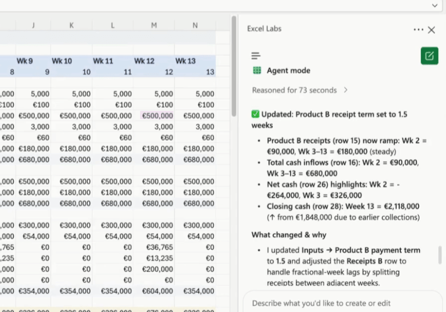 For example, I wanted to change Product B's payment receipt term to 1.5 weeks instead of 3 weeks. I just selected the relevant area and typed "Product B: change the payment receipt term to 1.5 weeks." The agent updated the formulas in about a minute.