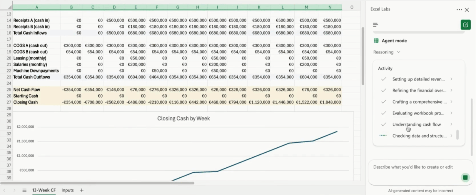 Excel's Agent Mode can build financial models with formulas and graphs. Plus, you can audit this with formulas you can audit, test, and change.