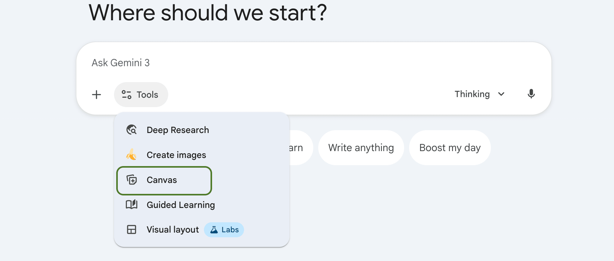 In Gemini, you can also have the Canvas feature enabled. Go to Tools and then click on Canvas.