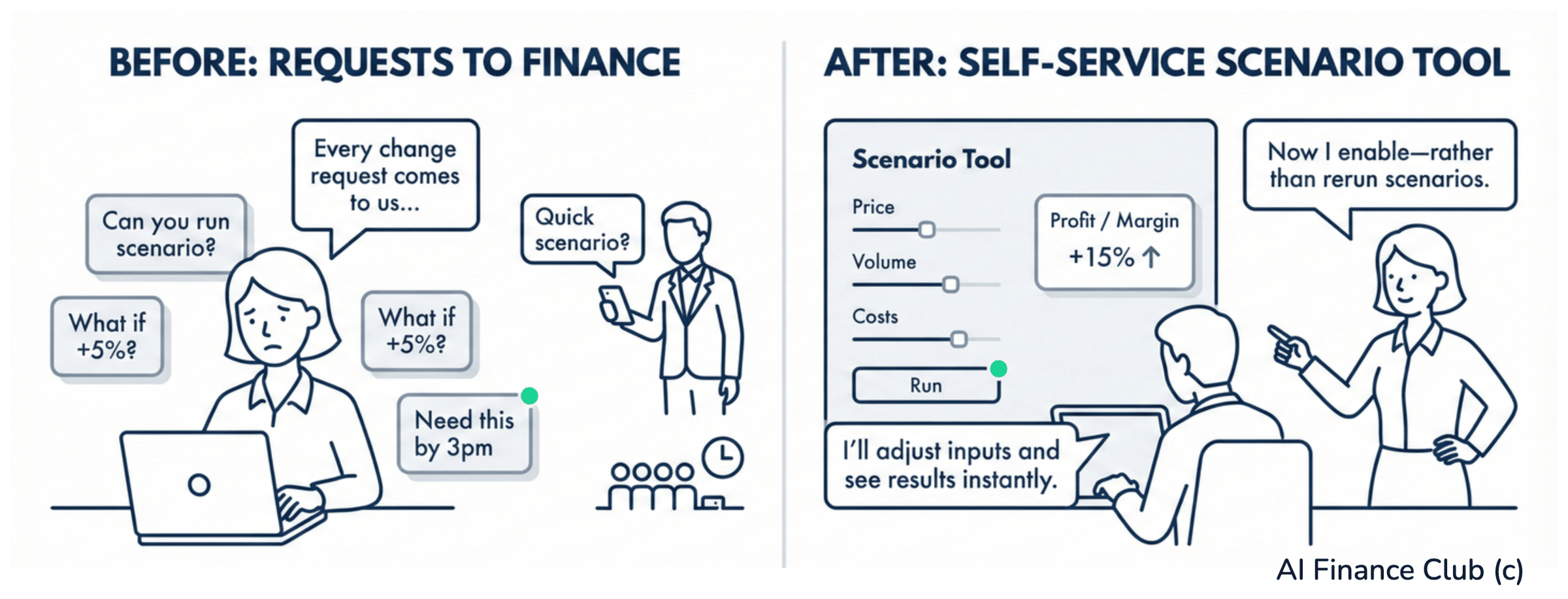 How many annoying info requests from other departments did your team get last week? Questions that you have answered like 24 times already. The same questions, 2 or 3 times a month. “How are we running against budget?” "What happens if we add two more headcount in Q2?" “When are those big clients due to pay? How’s cashflow?” I remember doing meetings with CEOs and heads of other departments and always having to answer these questions. Always having to go back with my team and change Excel files. And by the time we got the answer back, they had three more questions waiting. This is the problem. You've accidentally trained your business partners that finance is a service desk. They come to you for every calculation, not because they cannot find the info. But, because it’s easier to come to you. But what if they could answer their own questions? Today I'm going to show you how to build self-service scenario tools in about 5 minutes. This means, your business partners get instant answers - and - your team gets their time back.