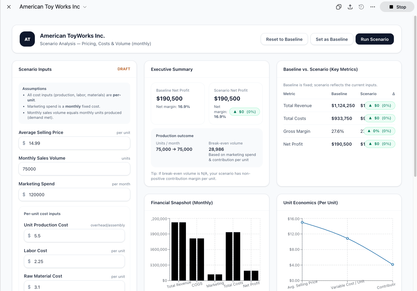 Christian’s scenario had inputs on the left where teams can add different numbers for production cost, selling price, and sales volumes. On the right side it displays a dashboard with the financial summary.