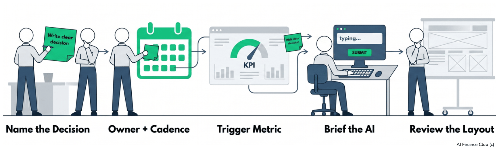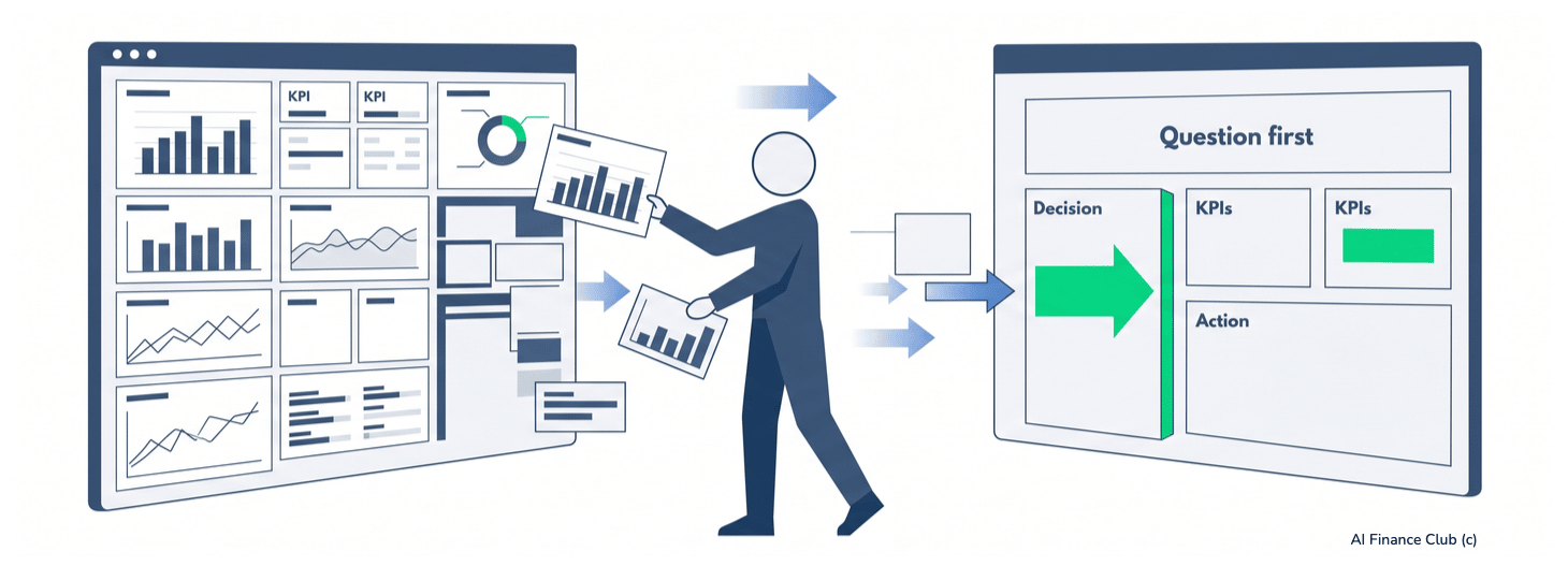 Before AI, I waited 6 months for a dashboard. It never came.It took 3-4 days of work in Excel for my team to create cost centre reports for each department. Then a BI team arrived and we were so happy we thought we'd have everything automated, and on a dashboard by the end of the month. Six months later? Nothing. Now AI can build the same thing in 10 minutes. But thinking about this now, I don't think the BI team failed because they were slow. I think they failed because nobody ever agreed on what the dashboard was for. And here's what's crazy. Procter & Gamble had solved this exact problem 14 years ago. Before AI even existed. They built dashboards around decisions (not data) and killed more than 80% of their BI reports doing it. I just didn't know yet. Dashboards you build too quickly become AI slop that nobody looks at. So today, I'm going to show you the method P&G proved works over a decade ago — and how to apply it to your AI dashboards this afternoon. Avoid becoming a 'Data Decorator'The moment you want to show an AI-built dashboard lands in front of the CEO, the board, or your team, the rules change. You need to have put real time into the design thinking first. Things like the decision you want to make, the KPIs that support it, and the layout. If you skip this, you are just creating AI slop that shows your data in a different way. And your credibility goes with it. You become a ‘data decorator’ where your CEO looks, nods, and forgets about it. In my AI Finance Accelerator we make all participants create a dashboard using AI in week 2. But, one that they can then use to create an impact in their business. Here are some examples of what they produce: The 'Decision Cockpit'Back to P&G. In 2012, their Business Services Group President Filippo Passerini asked a different question. Instead of "what dashboards should we build?" he asked, "what decisions do our leaders need to make?" Then he built dashboards around those decisions. He called them Decision Cockpits. And they replaced more than 80% of P&G's standardized reports, which were then deployed to 50,000+ employees across 50+ offices. Source | Practical Analytics Passerini's own description: his dashboards were "focused on forward-looking projections rather than historical reporting." That difference (building around the decision, not the data) was the focus in 2012 when P&G did it without AI. It's still the focus in 2026, when you can build the same thing with AI in 10 minutes. Your edge is your brief. You know which decisions matter. You know which KPIs drive them. You know what is important to the board. AI can build in 10 minutes what a BI team could not build in 6 months. But only you can decide what the dashboard is for. 5 steps to your first decision-first dashboardStep 1. Name the one decision (on a Post-It, before AI) Write one sentence: "This dashboard helps [role] decide [action] each [cadence]." Example: "This dashboard helps the CEO decide whether to approve Q2 hiring requests, monthly." If you cannot finish the sentence, do not build the dashboard. Step 2. Name the owner and the cadence Who acts on it, and how often? If the answer is "everyone, whenever" - stop. A dashboard with no named owner has no owner. Pick one name and one cadence. Weekly, monthly, per board meeting. Step 3. Name the trigger metric What single number, if it moved, would change the decision? That is the top of your dashboard. Everything else is evidence. Step 4. Brief the AI with the decision, not the data Use this prompt pattern: I am [role]. I need to decide [action]. The trigger metric is [KPI]. Build an HTML dashboard that surfaces [trigger metric] prominently, with 3 to 5 supporting KPIs as context. Attached: [data file]. Tell AI what the dashboard is for, before asking it to build. In my last Crash Course I uploaded a file and said: "I am the finance manager, I want to understand how to increase sales. I want to build the best dashboard." I was not asking it to build yet. After one minute I had a proposed set of metrics and a layout, and that was my chance to push back. One thing I push back on every time: data availability. Before you let AI do anything, walk through each proposed KPI and ask, can I pull this data from my systems, reliably, on the cadence the decision needs? If the answer is no for even one KPI, change it out or find something different for now. Otherwise you end up with a beautiful dashboard you can never populate and every month you waste time finding exports to create it. Step 5. Review the layout before the data is plotted When AI returns its proposed structure, check it against the decision. Is the trigger metric the most prominent element? Does every other chart earn its place by supporting that one decision? If not, keep on improving it. The CFO of HPE did this, this yearEarlier this year, Fortune published the story of Marie Myers, CFO of Hewlett Packard Enterprise (article here). Her weekly Monday review used to improve 100+ PowerPoint slides and hundreds of hours of manual prep across the business. Her team built an AI dashboard called Alfred (yes, after Batman's butler) that led to: A 40% cut in financial reporting cycle time, a 25% cut in processing costs, and 90% of the manual weekly prep removed. The super important bit? Myers told Fortune: "The first move wasn't to switch on AI, but to redesign the work." She rebuilt the process around the decisions her business needed to make - then switched on AI. And if you're thinking "yeah but I'm not Fortune 500" - this is good. You've got less complexity, less politics, and AI that costs $20 a month. If the CFO of a Fortune 500 company had to start with a blank sheet of paper, so can you. The One Thing To RememberMy BI team failed in 6 months. An AI dashboard can now fail in 10 minutes. The time saved is not the point. The decision behind the dashboard is. P&G proved this in 2012, without AI. HPE proved it still works in 2026, with AI. The tools change. The m
